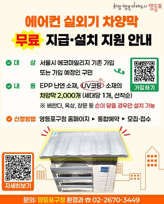 올해 지원 규모는 2,000가구로, 에코마일리지 가입자를 대상으로 한다. 특히 구민이 직접 차양막을 설치해야 하는 불편을 줄이기 위해 구에서 가구를 직접 방문해 설치를 지원하는 서비스도 지속 운영한다.