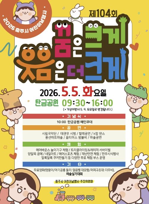 뉴한국방송뉴스통신사 권영분기자 기자 | 충주시는 오는 5월 5일 오전 9시 30분부터 탄금공원에서 ‘제104회 어린이날’을 기념하는 ‘2026 어린이날 행사’를 개최한다고 밝혔다.