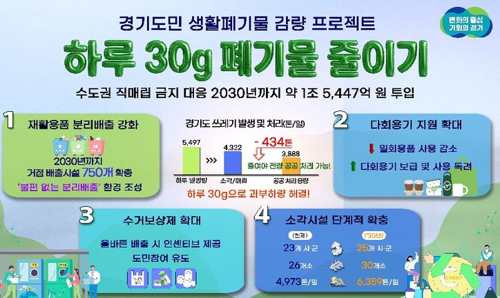 뉴한국방송뉴스통신사 신유철기자 기자 | 수도권 직매립 금지에 따른 생활쓰레기 감량을 위해 경기도가 2030년까지 5년간 약 1조 5,447억 원을 투입하는 ‘하루 30g, 도민실천형 생활폐기물 감량 프로젝트’를 추진한다.