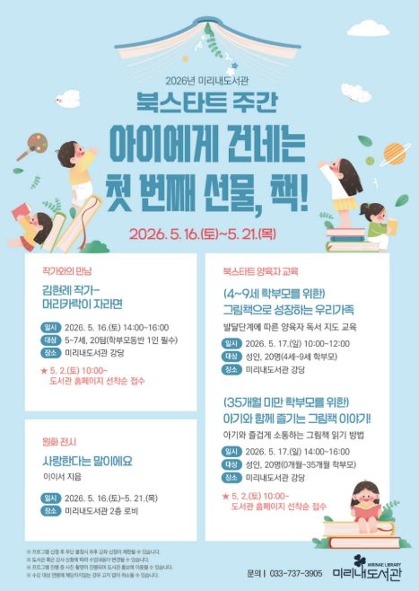 뉴한국방송뉴스통신사 양호선기자 기자 | 원주시 미리내도서관은 다음 달 16일부터 21일까지 북스타트코리아와 함께 ‘아이에게 건네는 첫 번째 선물, 책!’을 주제로 북스타트 주간 프로그램을 운영한다.