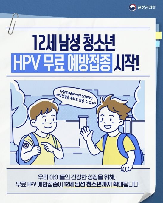 이번 대상 확대에 따라 12세 남학생은 6개월 간격으로 총 2회 무료 접종을 받을 수 있으며, 정부가 백신을 일괄 구매·공급하는 방식으로 안정적인 접종이 이뤄질 예정이다.