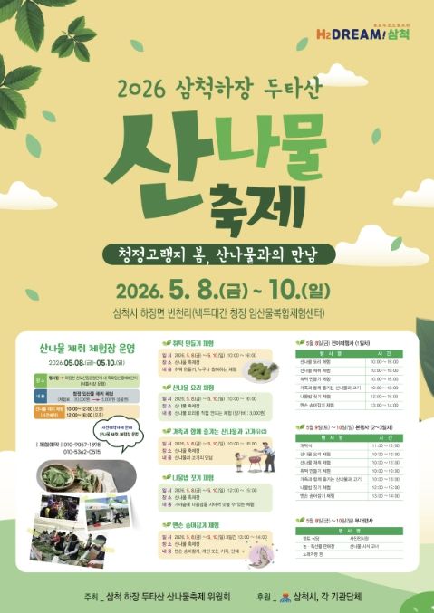 뉴한국방송뉴스통신사 양호선기자 기자 | 삼척시는 2026년 제13회 ‘삼척 하장 두타산 산나물 축제’가 5월 8일부터 10일까지 백두대간 청정임산물 복합체험센터(삼척시 하장면 두타로 499) 일원에서 개최된다고 밝혔다.