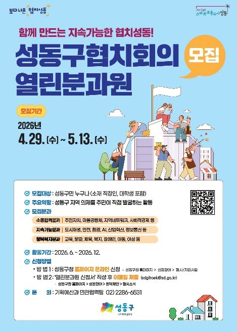 뉴한국방송뉴스통신사 신유철기자 기자 | 서울 성동구는 지역사회 주요 현안 해결과 민관 협치 활성화를 위해 '2026년 성동구 협치회의 열린분과원'을 4월 29일부터 5월 13일까지 15일간 모집한다고 밝혔다.