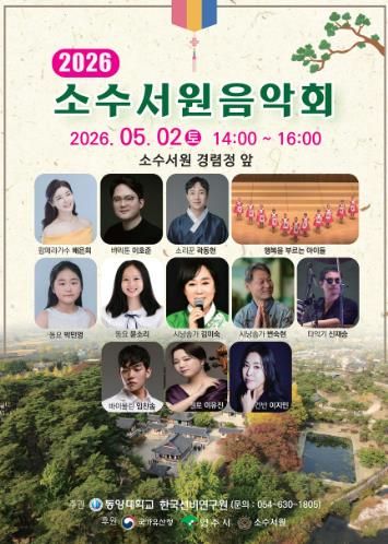 뉴한국방송뉴스통신사 신유철기자 기자 | 영주시는 오는 5월 2일 오후 2시, 유네스코 세계유산인 소수서원에서 역사와 예술이 어우러지는 ‘소수서원 음악회’를 개최한다고 밝혔다.