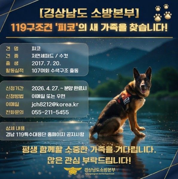 뉴한국방송뉴스통신사 신유철기자 기자 | 경상남도 소방본부는 각종 재난 현장에서 도민의 생명을 구하기 위해 활약해 온 119구조견 ‘피코’(저먼 셰퍼드, 29kg)가 6년간의 임무를 마치고 명예롭게 은퇴함에 따라, 제2의 견생을 함께할 가족을 찾고 있다고 밝혔다.