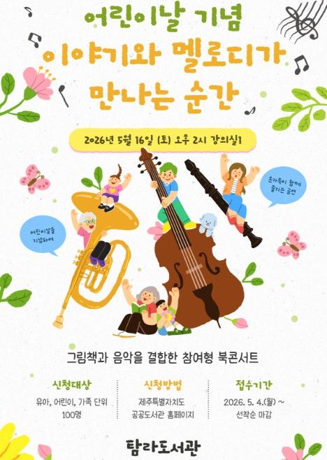 뉴한국방송뉴스통신사 신유철기자 기자 | 제주시 탐라도서관은 어린이날을 맞아 5월 16일 도서관 강의실에서 온 가족이 함께 즐길 수 있는 북콘서트 ‘이야기와 멜로디가 만나는 순간’을 개최한다.