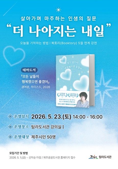 뉴한국방송뉴스통신사 신유철기자 기자 | 제주시 탐라도서관은 삶과 글을 통해 현대인의 일상 속에서 행복을 발견하고, 스스로를 돌보는 방법을 제시하기 위해 5월 북토리 강연을 운영한다.