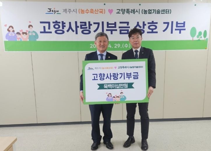뉴한국방송뉴스통신사 신유철기자 기자 | 제주시는 4월 29일 고양특례시 농업기술센터에서 고양특례시와 고향사랑기부금 상호 전달식을 갖고 지역 간 상생과 협력 강화에 뜻을 모았다.
