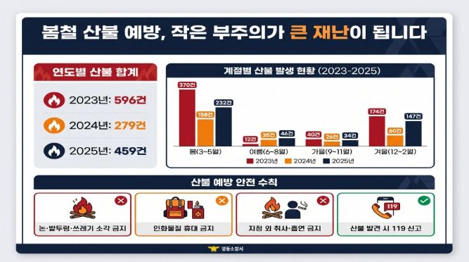 이에 따라 소방서는 △논·밭두렁 및 쓰레기 소각 금지 △입산 시 인화물질 휴대 금지 △지정된 장소 외 취사·흡연 금지 △산불 발견 시 즉시 119 신고 등 기본 안전수칙 준수를 강조했다.
