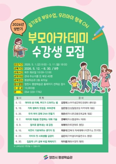뉴한국방송뉴스통신사 신유철기자 기자 | 영천시 평생학습관은 5월 1일부터 11일까지 ‘2026년 상반기 부모아카데미’ 수강생을 모집한다.