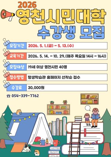 뉴한국방송뉴스통신사 신유철기자 기자 | 영천시 평생학습관은 5월 1일부터 13일까지 ‘2026년 영천시민대학’ 수강생 40명을 선착순 모집한다고 밝혔다.