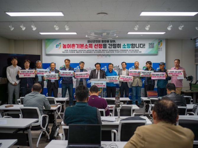 뉴한국방송뉴스통신사 신태공 기자 | 금산군사회단체연합회는 29일 금산군청 브리핑룸에서 기자회견을 열고 중앙정부에서 추진하는 농어촌기본소득 추가 공모사업에 금산군이 참여하는 것을 적극 지지하며 금산 미래를 위해 농어촌기본소득 선정을 위해 힘을 모을 것을 강조했다.