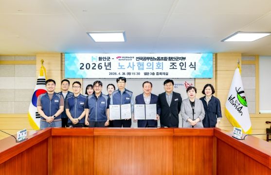 뉴한국방송뉴스통신사 신유철기자 기자 | 함안군은 지난 28일 군청 3층 중회의실에서 전국공무원노동조합 함안군지부(지부장 조주환)와 공무원 권익 향상과 복지 증진을 위한 노사협의회 합의서에 최종 서명했다고 밝혔다.