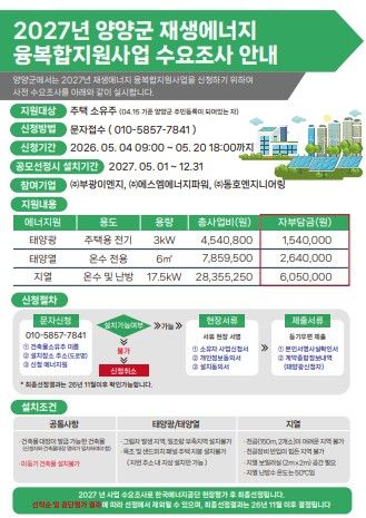 뉴한국방송뉴스통신사 양호선기자 기자 | 양양군이 에너지 비용 절감과 온실가스 감축을 위한 ‘2027년 신재생에너지 융복합지원사업’ 공모 신청을 위해 오는 5월 4일부터 20일까지 사업 참여 희망자를 모집한다.