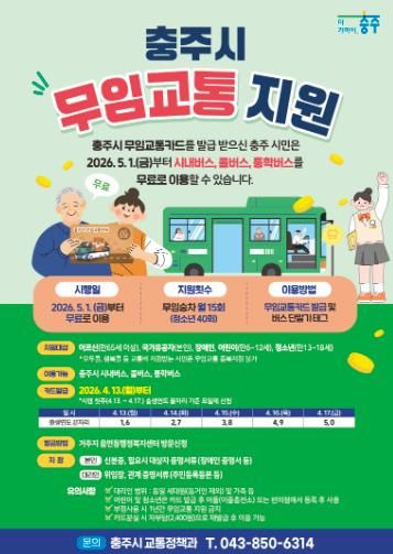 대상자들은 충주시 관내 시내버스는 물론, 수요응답형 콜버스와 시내 동 지역 통학버스까지 무임으로 이용할 수 있다.