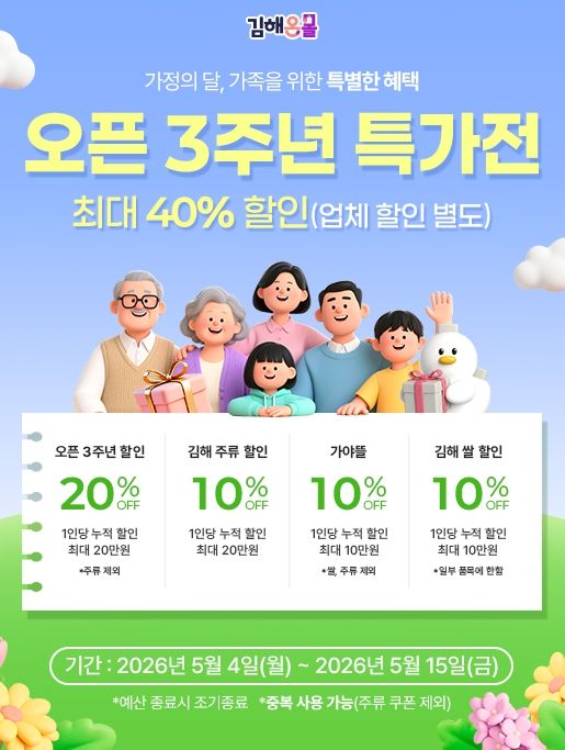 이번 기획전은 오는 5월 4일 11시부터 5월 15일 17시까지 진행되며, 김해온몰 전 상품을 대상으로 풍성한 할인 혜택과 고객 참여 이벤트를 선보인다.