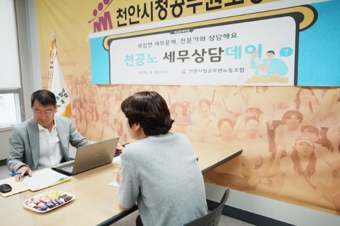 뉴한국방송뉴스통신사 신태공 기자 | 천안시청공무원노동조합은 4월 29일 노동조합 사무실에서 조합원들의 세무 관련 고충 해소와 재산권 보호를 위한 '조합원 맞춤형 세무상담데이'를 성황리에 개최했다고 밝혔다.