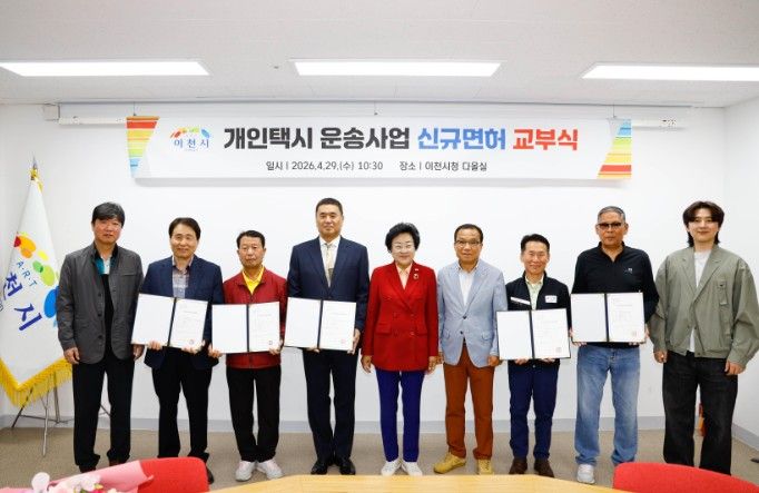 뉴한국방송뉴스통신사 신유철기자 기자 | 이천시는 29일 시청 다올실에서 개인택시운송사업 신규 면허증 교부식을 개최하고, 심사를 통해 최종 선정된 5명의 대상자에게 면허증을 전달했다고 밝혔다.