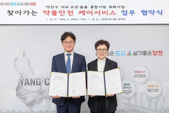뉴한국방송뉴스통신사 신유철기자 기자 | 양천구는 29일 오전 구청 5층 회의실에서 양천구약사회와 ‘찾아가는 약물안전 케어서비스’ 추진을 위한 업무협약(MOU)을 체결했다고 밝혔다. 이번 협약은 약물관리가 필요한 취약계층을 대상으로 약사가 직접 가정을 방문해 맞춤형 서비스를 제공하는 양천구 통합돌봄 특화사업의 일환이다.