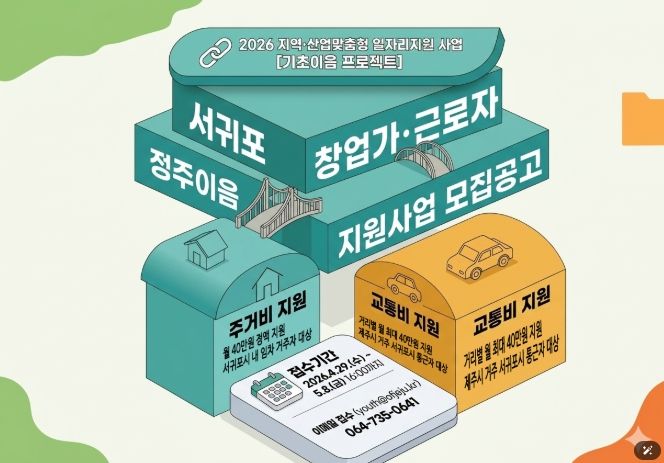 뉴한국방송뉴스통신사 신유철기자 기자 | 제주특별자치도와 제주콘텐츠진흥원(원장 강민부)은 고용노동부와 함께 서귀포시 창업 생태계 활성화와 우수 인력의 안정적인 지역 정착을 위해 '2026 서귀포 창업가·근로자 정주이음 지원사업' 참여자를 모집한다.