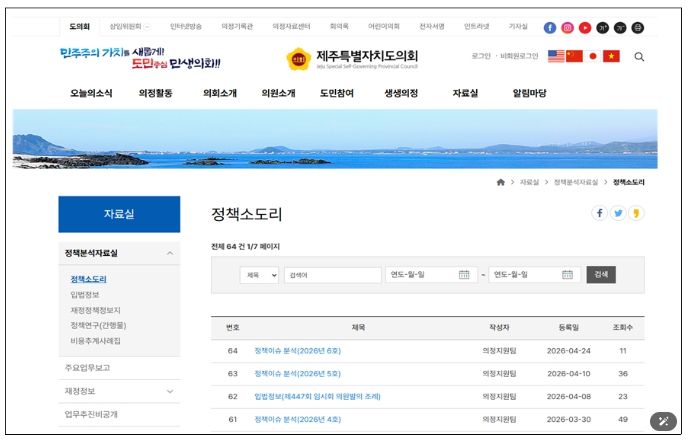 특히 정책 이슈는 ▲체육, ▲경제·노동, ▲교통·환경 등 분야별 제주 지역 주요 현안을 중심으로 심층 분석 형태로 제공되고 있으며, 입법정보는 회기별 주요 조례 제·개정 사항 및 타 시도의최신 입법 사례를 담고 있다.