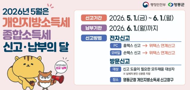 한편, 개인지방소득세 신고와 관련한 자세한 사항은 영동군청 재무과 지방소득세팀으로 문의하면 된다.