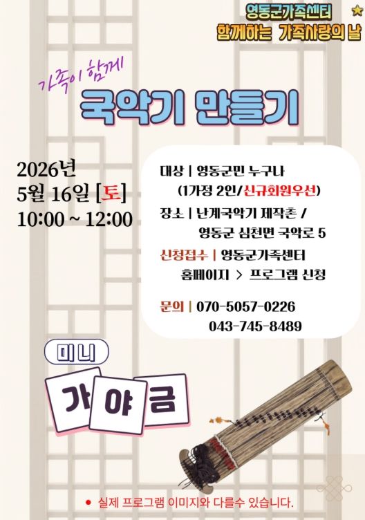이번 프로그램은 오는 5월 16일 오전 10시부터 12시까지 심천면에 위치한 난계국악기제작촌에서 진행되며, 영동군민 10가정을 대상으로 운영된다.