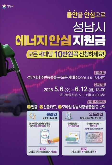 뉴한국방송뉴스통신사 신유철기자 기자 | 성남시는 중동 사태에 따른 국가 자원안보 위기 경보 발령으로 경제적 부담이 커진 시민들을 지원하기 위해 전국 최초로 ‘성남시 에너지 안심지원금’을 오는 5월 6일부터 신청을 받는다고 밝혔다.