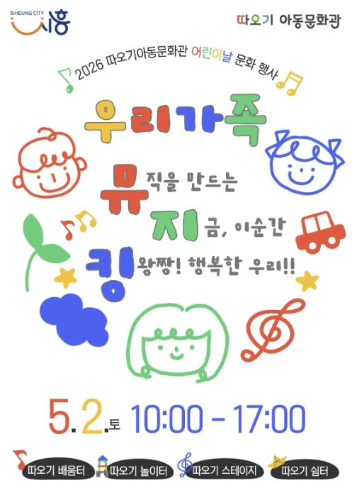 뉴한국방송뉴스통신사 신유철기자 기자 | 시흥시 따오기아동문화관은 어린이날을 맞아 오는 5월 2일 오전 10시부터 오후 5시까지 따오기아동문화관 야외 일대에서 2026년 어린이날 문화행사 ‘우리가족 뮤지킹’을 개최한다.