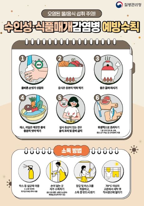 수인성ㆍ식품매개감염병은 병원성 세균, 바이러스, 원충에 오염된 물이나 식품을 섭취해 구토, 설사, 복통 등의 장관 증상을 유발한다. 이를 예방하기 위해서는 ▲올바른 손 씻기 생활화 ▲음식 충분히 익혀 먹기 ▲물 끓여 마시기 ▲채소ㆍ과일 깨끗한 물에 충분히 씻어 먹기 ▲설사 증상 시 음식 조리 및 준비 금지 ▲위생적으로 조리하기 등 예방수칙을 준수해야 한다.