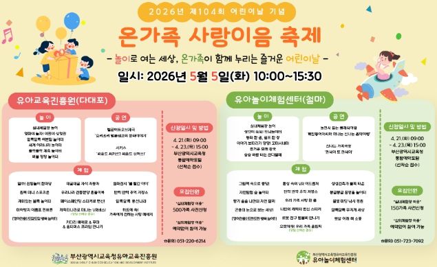뉴한국방송뉴스통신사 신유철기자 기자 | 부산광역시교육청유아교육진흥원은 제104회 어린이날을 맞아 오는 5월 5일 오전 10시부터 유아교육진흥원(다대포)과 유아놀이체험센터(철마)에서 3~5세 유아와 학부모가 참여하는‘온가족 사랑이음 축제’를 개최한다.