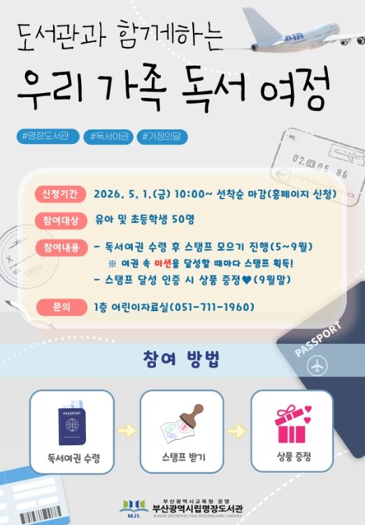 프로그램은 ‘독서여권’을 활용해 가족 공동 독서, 도서관 공간 탐방, 일상 독서 챌린지, 체험형 독서 미션 등을 수행하며 스탬프를 획득하는 방식으로 운영된다.