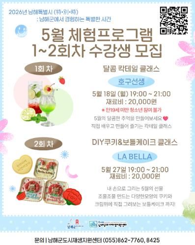뉴한국방송뉴스통신사 신유철기자 기자 | 남해군 도시재생지원센터가 신록이 짙어가는 5월을 맞아, 군민들에게 일상 속 특별한 미식 경험과 힐링을 선사할 ‘5월 쿠킹클래스’를 마련하고 수강생 모집에 나선다.