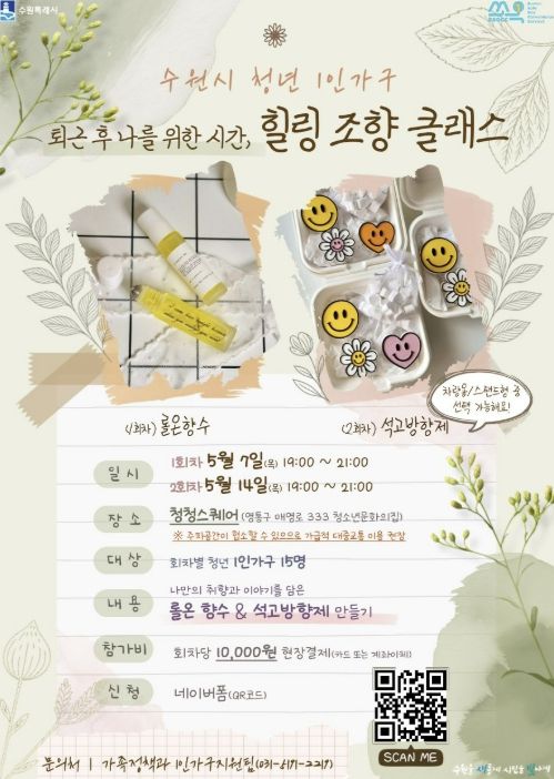 영통구에서는 청년 1인가구 비율이 높은 지역 특성을 반영해 정서 지원 중심 프로그램 ‘힐링 조향 클래스’를 운영한다. 5월 7일과 14일 청청스퀘어에서 열리며, 회차별 15명씩 총 30명이 참여할 수 있다.