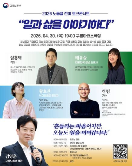 뉴한국방송뉴스통신사 신유철기자 기자 | 고용노동부는 4월 30일 저녁 7시, 서울 마포구 소재 ‘구름아래소극장’에서 청년 200여 명과 함께 일에 대한 고민을 나누며, 노동의 가치를 다시 한번 생각해 보는'일과 삶을 이야기하다' 토크콘서트를 개최했다고 밝혔다.