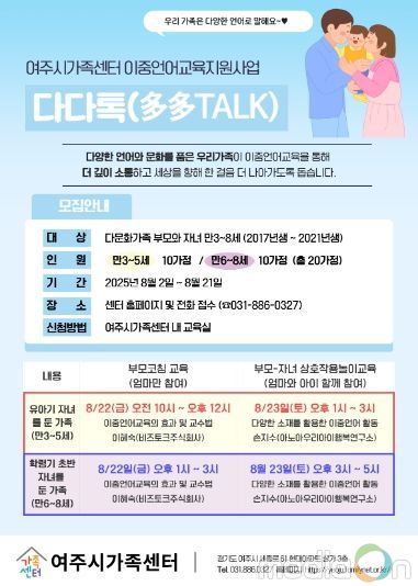 뉴한국방송뉴스통신사 신유철기자 기자 | 여주시가족센터는 오는 8월 22일~23일 양일간 ‘다문화가족 이중언어교육지원사업’을 실시한다고 밝혔다.