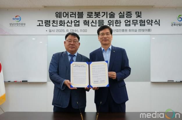 뉴한국방송뉴스통신사 신유철기자 기자 | 성남산업진흥원은 13일 킨스타워에서 군포산업진흥원과 초고령사회 대비 웨어러블 로봇 기술 실증 및 고령친화산업 활성화를 위한 업무협약(MOU)을 체결했다.