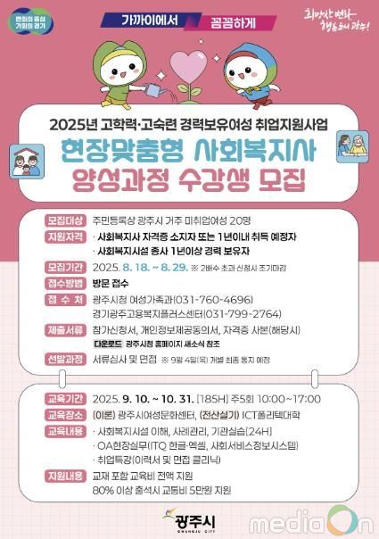 뉴한국방송뉴스통신사 신유철기자 기자 | 광주시는 경력 보유(단절) 여성의 재취업 역량 강화를 위해 오는 29일까지 ‘현장 맞춤형 사회복지사 양성 과정’ 수강생을 모집한다고 14일 밝혔다.