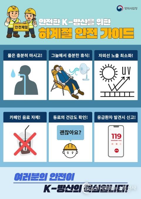 이에 따라, 방위사업청과 방산 조선소 5개 사는 작업자 온열질환 예방수칙을 담은 포스터를 제작해 배포하고, 자외선 차단을 위한 쿨링 마스크를 배부하는 등 현장 중심의 실질적인 안전사고 예방 조치를 추진했다.