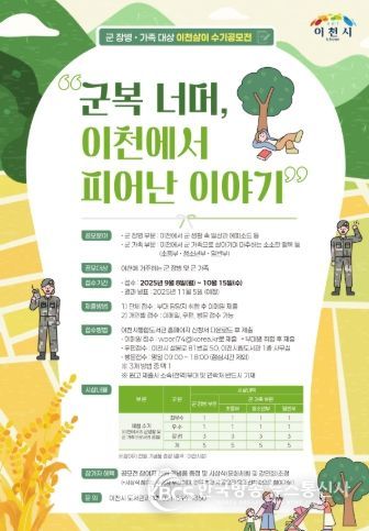 뉴한국방송뉴스통신사 신유철기자 기자 | 이천시 도서관은 군 장병과 그 가족을 대상으로 ‘군복 너머 이천에서 피어난 이야기’라는 주제로 이천살이 수기 공모전을 개최한다.
