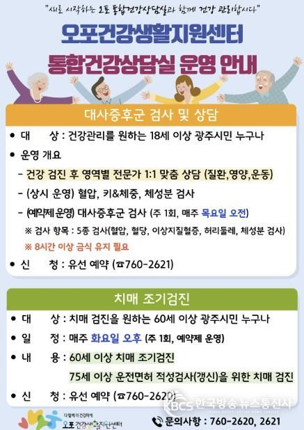 뉴한국방송뉴스통신사 신유철기자 기자 | 광주시 오포건강생활지원센터는 오는 9월 1일부터 ‘통합건강상담실’을 상시 운영하며 시민 맞춤형 건강서비스 제공에 나선다고 28일 밝혔다.