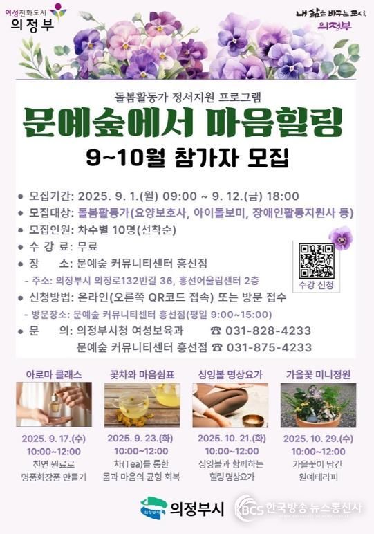 뉴한국방송뉴스통신사 신유철기자 기자 | 의정부시는 9월 1일부터 돌봄활동가를 위한 정서 지원 프로그램 ‘문예숲에서 마음힐링’의 9~10월 참가자를 모집한다.