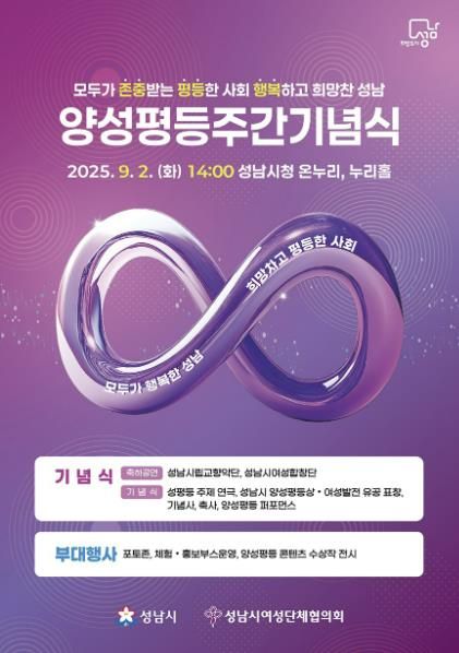 뉴한국방송뉴스통신사 신유철기자 기자 | 성남시는 양성평등주간(9.1~7)을 기념해 오는 9월 2일 시청 1층 온누리와 로비에서 다양한 시민 행사를 연다.
