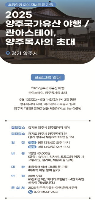 뉴한국방송뉴스통신사 신유철기자 기자 | 양주시가 ‘2025 양주국가유산 야행’ 주제(8夜) 가운데 하나인 ‘야숙(夜宿)’ 프로그램에 대한 참가자를 모집한다고 29일 밝혔다.