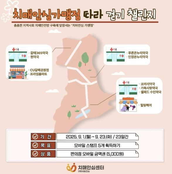 뉴한국방송뉴스통신사 신유철기자 기자 | 구리시는 오는 9월 1일부터 23일 동안 ‘치매안심가맹점 따라 걷기 스탬프 챌린지’를 운영한다.