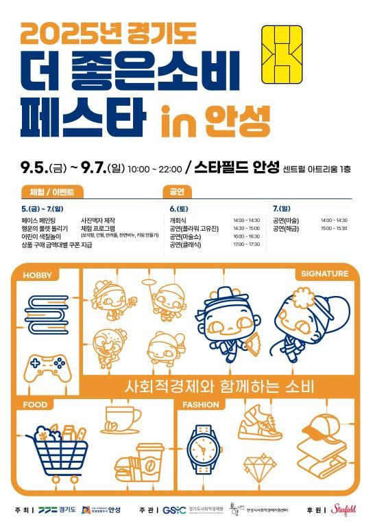 뉴한국방송뉴스통신사 신유철기자 기자 | 안성시가 오는 9월 5일부터 9월 7일까지 3일간 오전 10시부터 오후 10시까지 스타필드 안성 센트럴 아트리움 1층에서 ‘2025 안성시 더 좋은소비 페스타’를 개최한다.