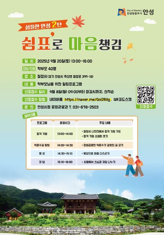 뉴한국방송뉴스통신사 신유철기자 기자 | 안성시는 오는 9월 20일 오후 1시부터 4시까지 죽산면 칠장사 일원에서 학부모를 위한 힐링 프로그램 '쉼플한 안성 2탄, 쉼표로 마음챙김'을 운영한다. 이번 행사는 입시를 앞둔 자녀가 있는 학부모들에게 가을 정취 속에서 잠시 멈춤의 시간을 제공하고, 자녀의 건강과 학업 성취를 기원할 수 있도록 마련됐다.