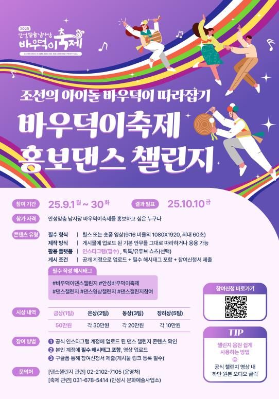 뉴한국방송뉴스통신사 신유철기자 기자 | 안성시는 ‘2025 안성맞춤 남사당 바우덕이축제’ 홍보 댄스 챌린지를 오는 9월 1일부터 9월 30일까지 개최했다고 밝혔다.