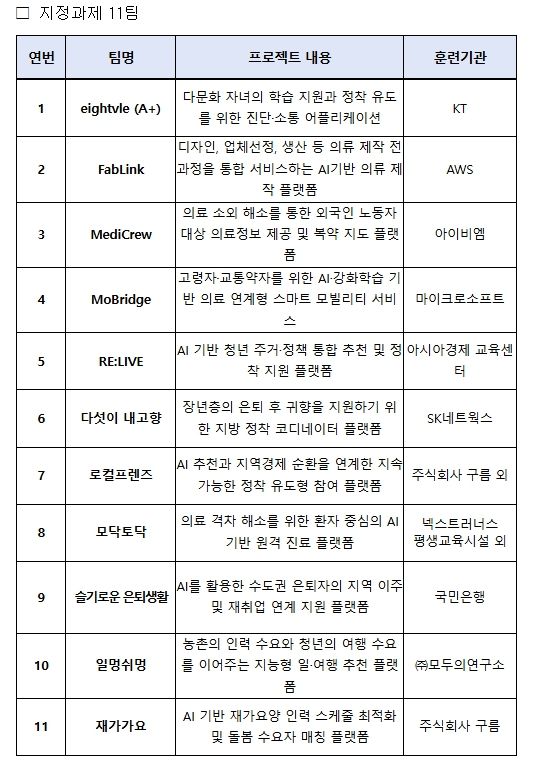 이번 해커톤 참가자들은 모두 노동부의 대표 디지털 훈련사업인 ‘K-디지털 트레이닝’에 참여했다. ‘K-디지털 트레이닝’은 기업 실무에 기반한 프로젝트 중심의 훈련으로 인공지능(IT) 분야 취업을 희망하는 청년들에게 많은 인기를 끌었다. 참가자들은 ‘지역 균형 발전을 위한 디지털 사회서비스 개발’이라는 지정 과제를 두고 프로젝트를 수행하며 그간 훈련을 통해 갈고닦은 기술을 선보일 예정이다.