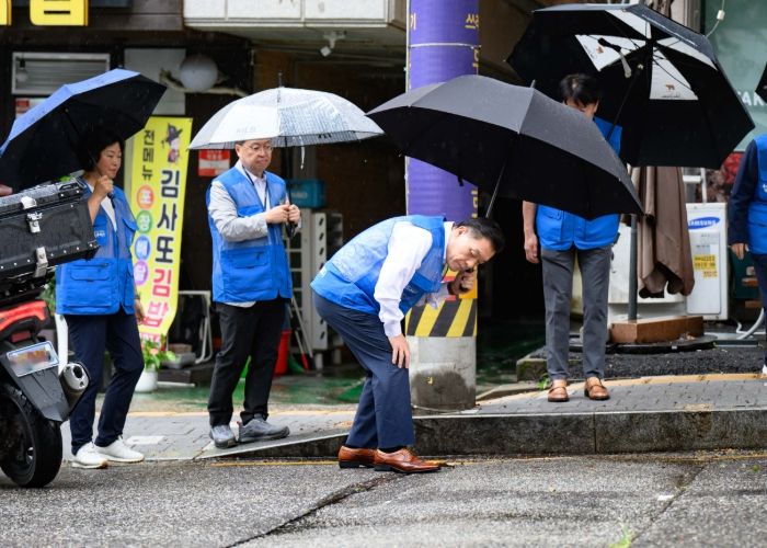 이재준 수원시장이 4일 오전 곡선동 민원 현장에서 ‘새빛 현장시장실’을 열고, 민원이 발생한 도로의 요철을 자세히 살펴봤다. 또 박병기씨와 곡선동 주민자치회장, 통장협의회장 등 주민들을 만나 이야기를 나눴다.
